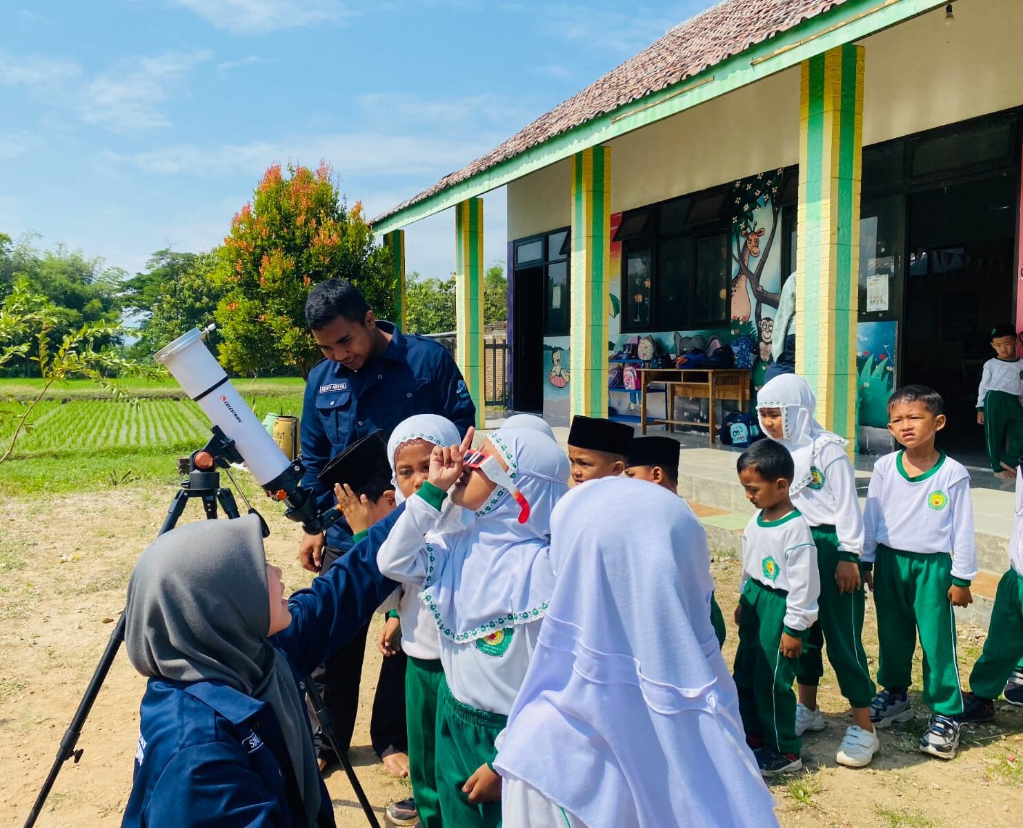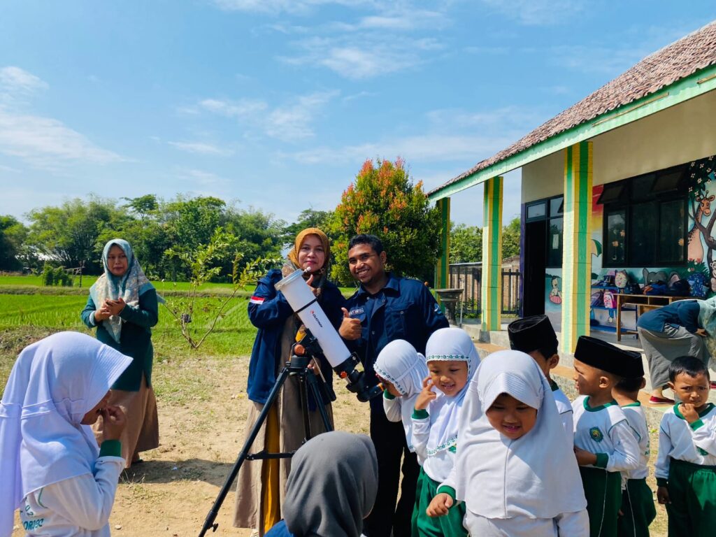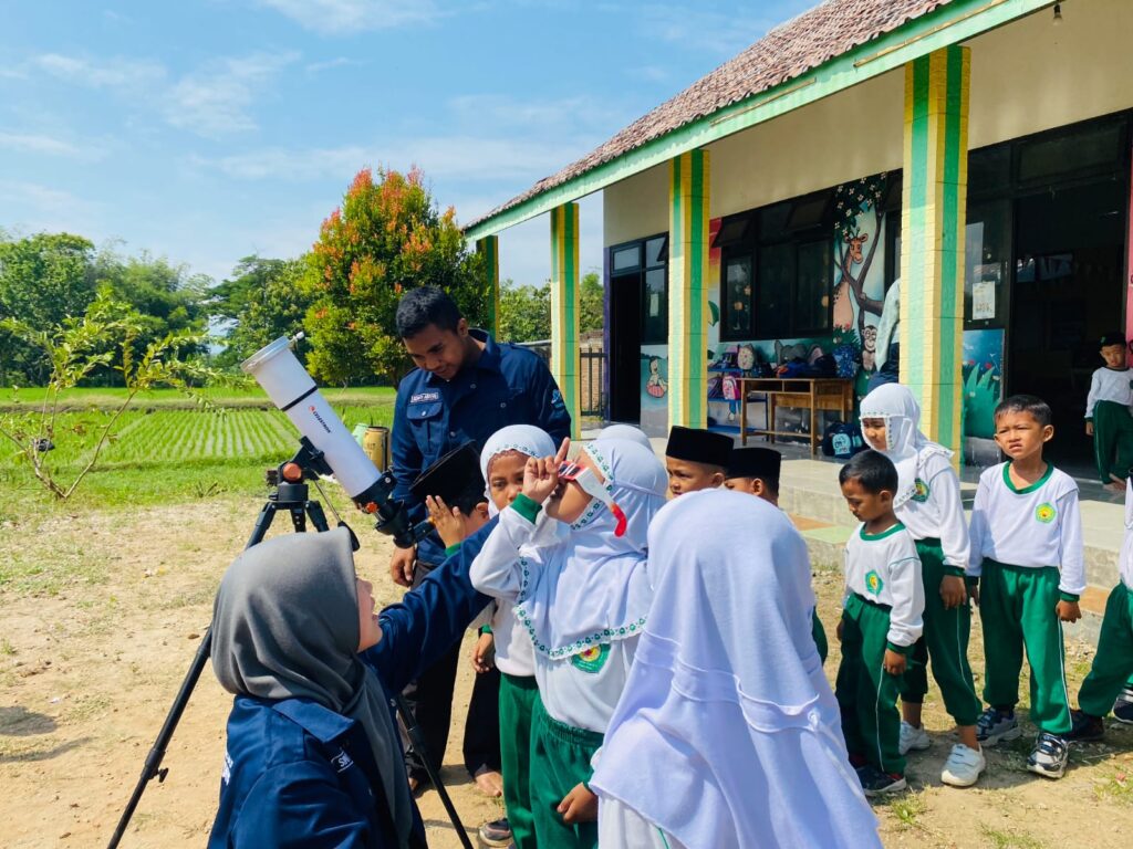 Suasana keceriaan tampak jelas di wajah para peserta cilik ketika mereka diajak mengamati Matahari dengan aman, sambil belajar mengenal benda langit dari dekat. Kegiatan ini didampingi oleh para kader aktif Reog Astronomy Club, yaitu April, Sintya, Aulia, dan Abdul, yang tampil penuh kreativitas dengan menyampaikan materi melalui permainan dan aktivitas seru.