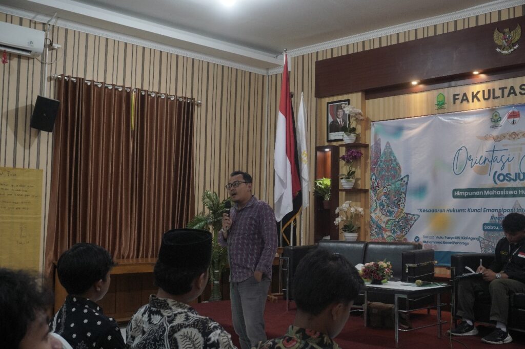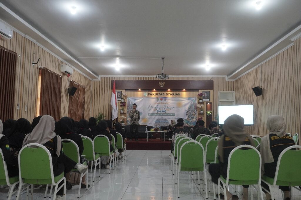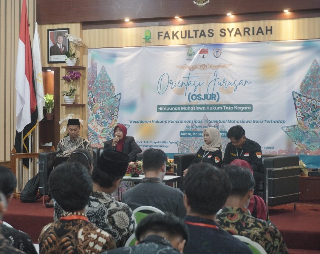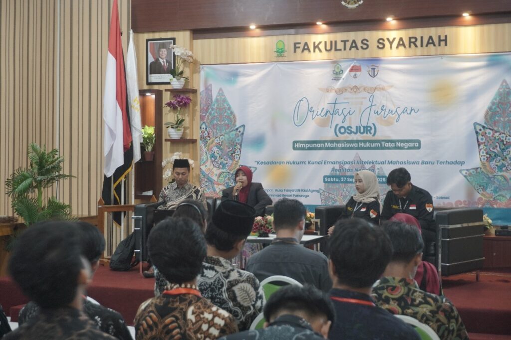 Fasya Media Center – Ponorogo, 27 September 2025 – Jurusan Hukum Tata Negara Fakultas Syariah UIN Kiai Ageng Muhammad Besari Ponorogo sukses menyelenggarakan Orientasi Jurusan (Osjur) dengan tema “Kesadaran Hukum: Kunci Emansipasi Intelektual Mahasiswa Baru Terhadap Realitas Negara”, dengan dihadiri Ketua Jurusan HTN, Sekretaris, Staf Jurusan, Narasumber, Sema dan Dema Fakultas Syariah, HMJ Jurusan HTN, serta seluruh mahasiswa baru Jurusan HTN. Kegiatan Osjur yang dilaksanakan di Aula Fakultas Syariah, berjalan langcar dan suskes. Kegiatan orientasi jurusan menjadi penting sebagai wadah pengenalan awal bagi mahasiswa baru. Orientasi bukan hanya memperkenalkan lingkungan akademik, melainkan juga menanamkan pemahaman dasar mengenai nilai-nilai keilmuan hukum, etika intelektual, serta sikap kritis yang berbasis pada metodologi ilmiah dan aturan hukum yang pasti. Dengan bekal tersebut, mahasiswa diharapkan mampu memilah informasi, memahami hukum secara objektif, serta berperan sebagai generasi akademisi yang cerdas, kritis, dan bertanggung jawab dalam mengamalkan ilmunya.