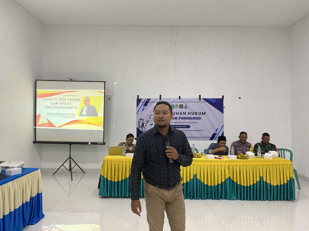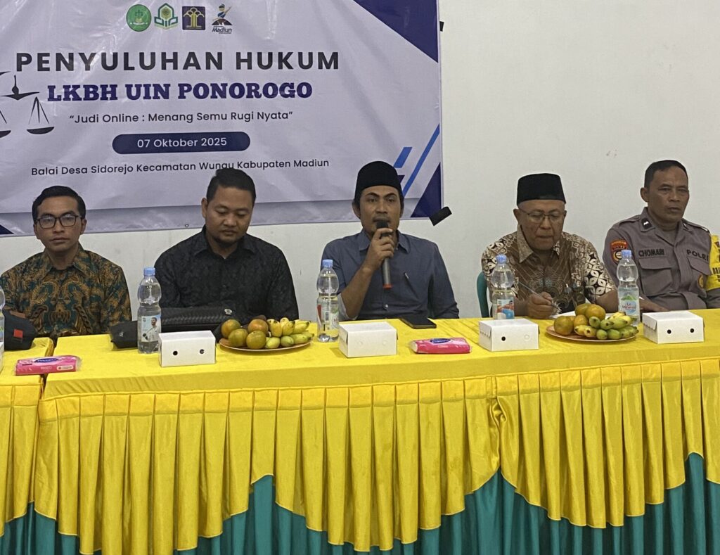 Fasya Media Center – Madiun, 7 Oktober 2025 – Lembaga Konsultasi dan Bantuan Hukum (LKBH) Fakultas Syariah Universitas Islam Negeri (UIN) Kiai Ageng Muhammad Besari Ponorogo sukses menyelenggarakan penyuluhan hukum di Desa Sidorejo, Kecamatan Wungu, Kabupaten Madiun. Tema penyuluhan hukum kali ini adalah “Judi Online : Menang Semu, Rugi Nyata”. Acara yang dilaksanakan di ruang pertemuan Desa Sidorejo pada Selasa malam 7 Oktober 2025 dihadiri Kepala Desa Sidorejo serta Perangkat Desa, Ketua BPD beserta anggotanya, serta Ketua LPMD beserta anggotanya, seluruh tokoh masyarakat desa, Tim LKBH UIN Ponorogo dan para narasumber. Penyuluhan Hukum kali ini menghadirkan 2 narasumber kompeten dari Tim LKBH Fakultas Syariah UIN Ponorogo, antara lain: